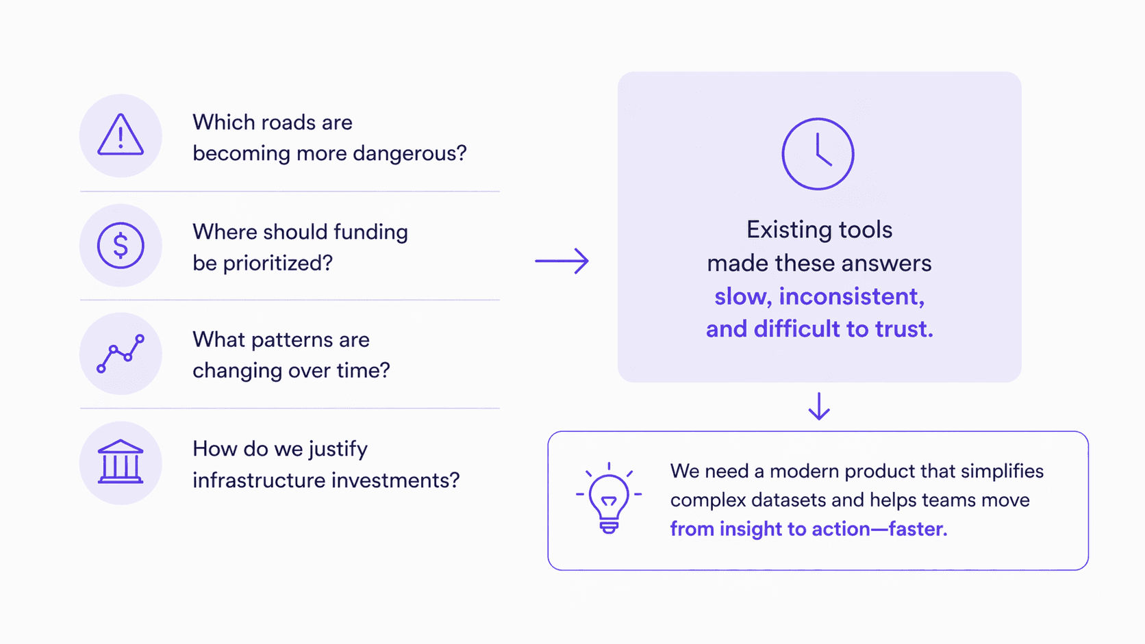 Transportation agencies relied on outdated crash reports, fragmented tools, and manual workflows to make high-stakes decisions.
